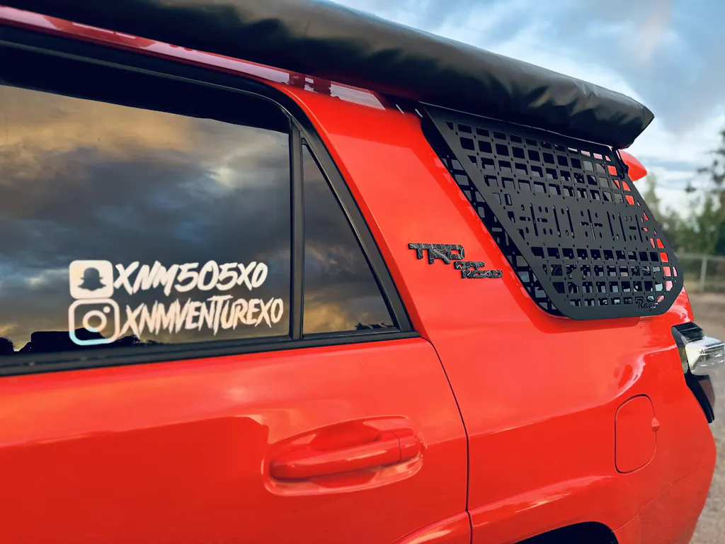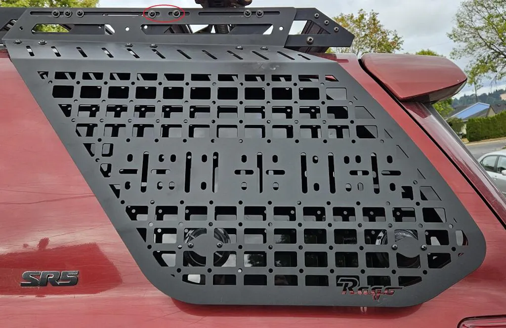 The E-MSP attaches to Rago, Sherpa, and Prinsu style roof racks. Each molle panel is made from 1/8" PNO and powder coated Hammer Black for extra durability.