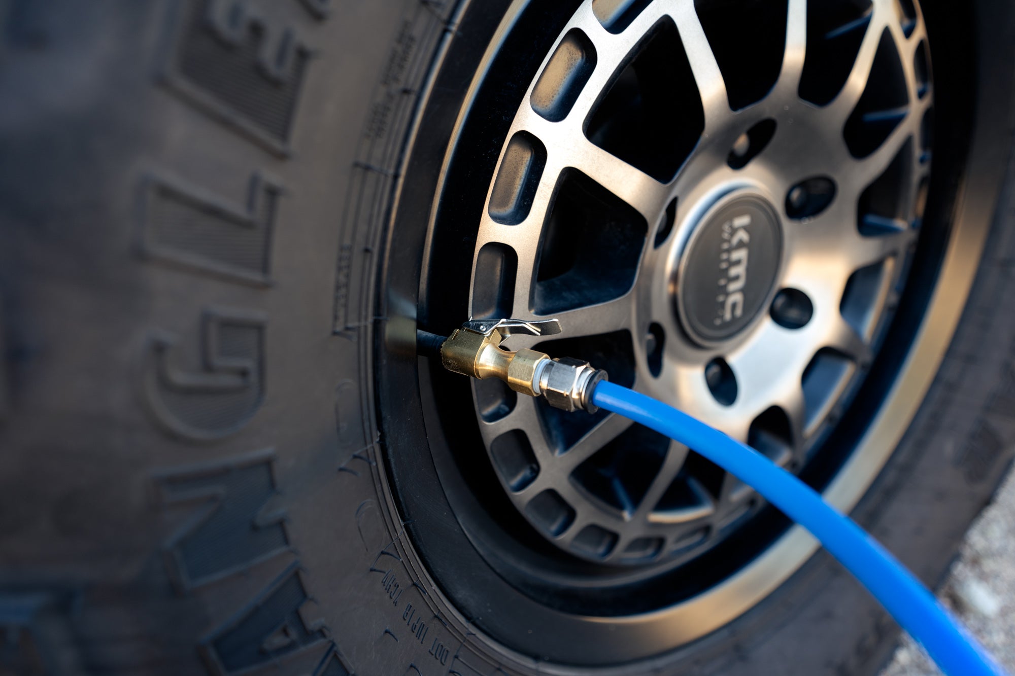 This system will allow you to air-up all 4 tires under 4-9 minutes using our 3/8-inch high flow air lines. (Tire inflation times depend on tire size, original pressure and single or duel ARB air compressor used). Included in this expansive kit is everything needed to see gauged tire pressure to all 4 wheels when the system is hooked up. Deflate all 4 tires at the same time getting you back on the trail as fast as possible. Components of the kit include braded stainless steel inlet line, solid brass fittings and chucks, billet aluminum distribution block, high quality slide valves, and 3/8-inch high flow air lines.