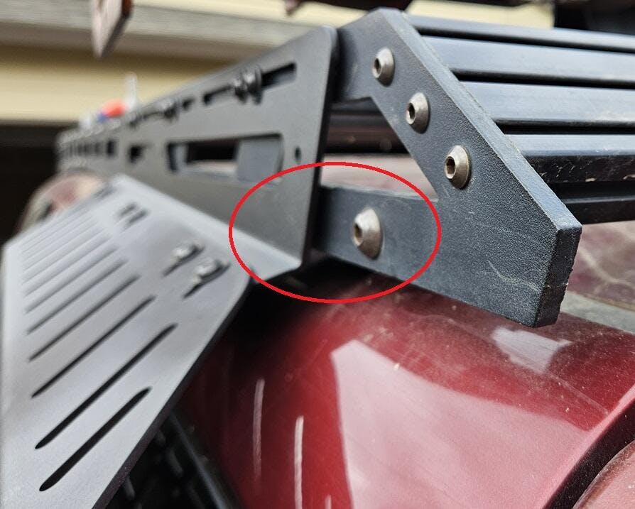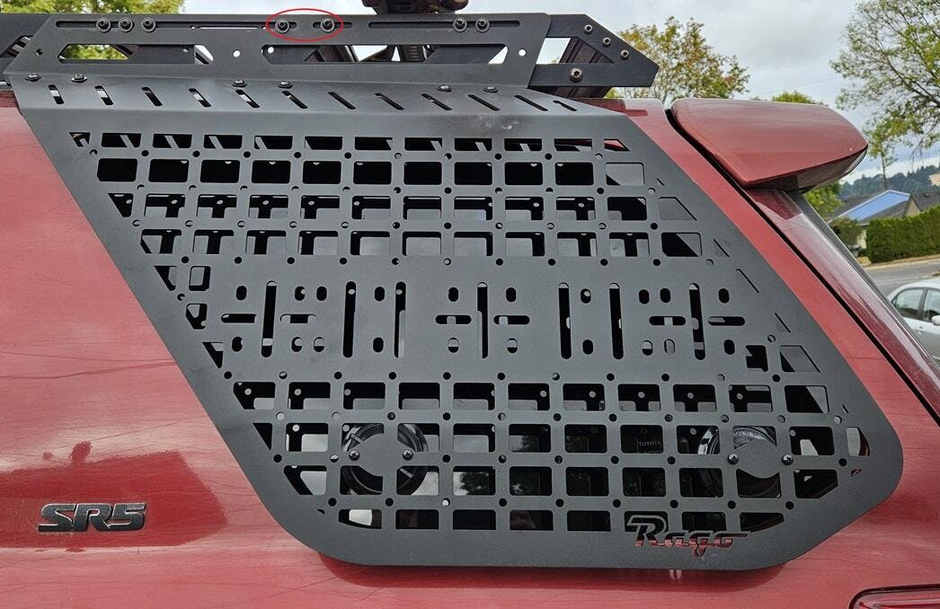The E-MSP attaches to Rago, Sherpa, and Prinsu style roof racks. Each molle panel is made from 1/8" PNO and powder coated Hammer Black for extra durability.