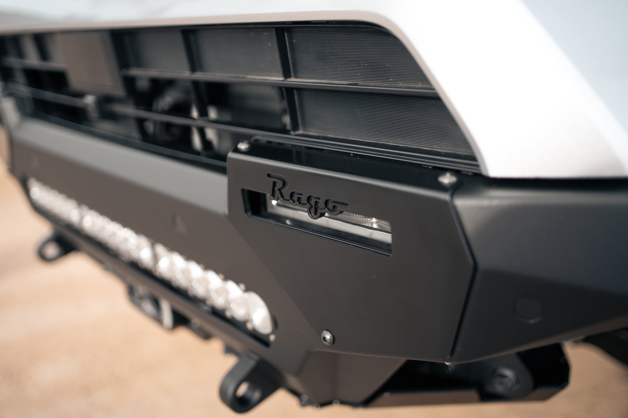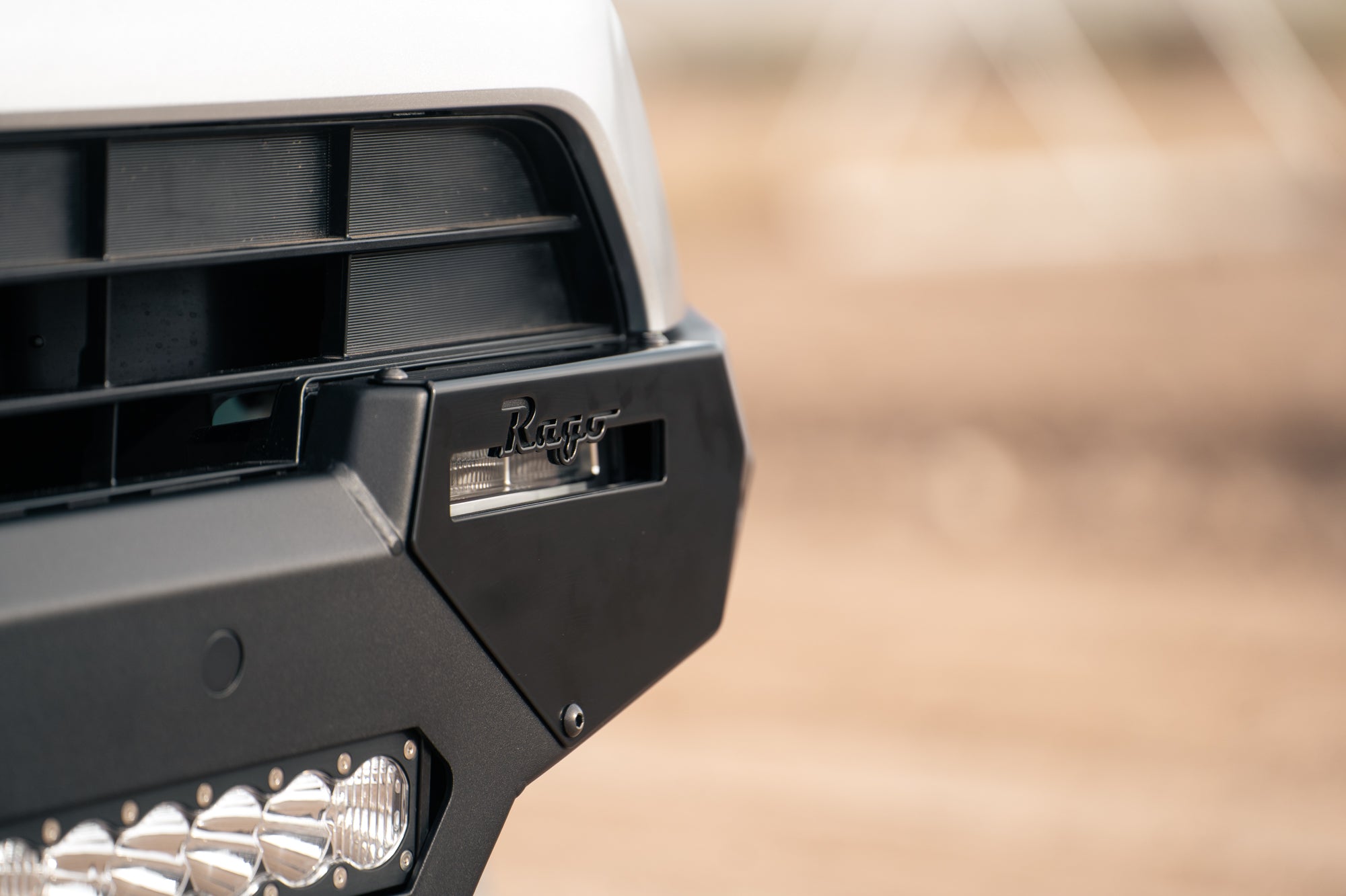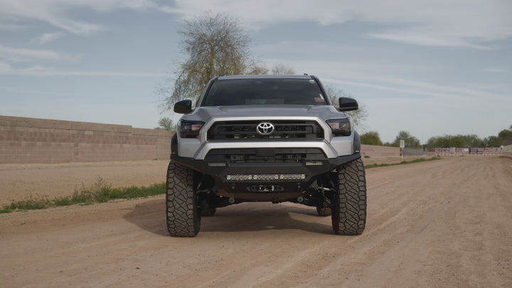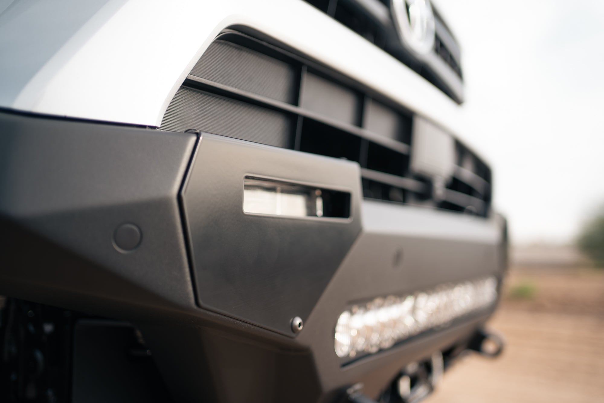 A heavy duty concealed winch mount and integrated 1-inch thick D-ring clevis mounts that accept 3/4-inch D-rings provide recovery options. The integrated center light mount accommodates a 30-inch dual row LED light bar to improve nighttime visibility on the trail. The high clearance sides open the wheel well to support oversized tires and maximize approach angles when navigating tough terrain. The bumper retains full functionality of Toyota Safety Sense, OEM parking sensors, and all factory drive assist features. An optional heavy-duty 3/16-inch aluminum skid plate is available for additional underbody protection.