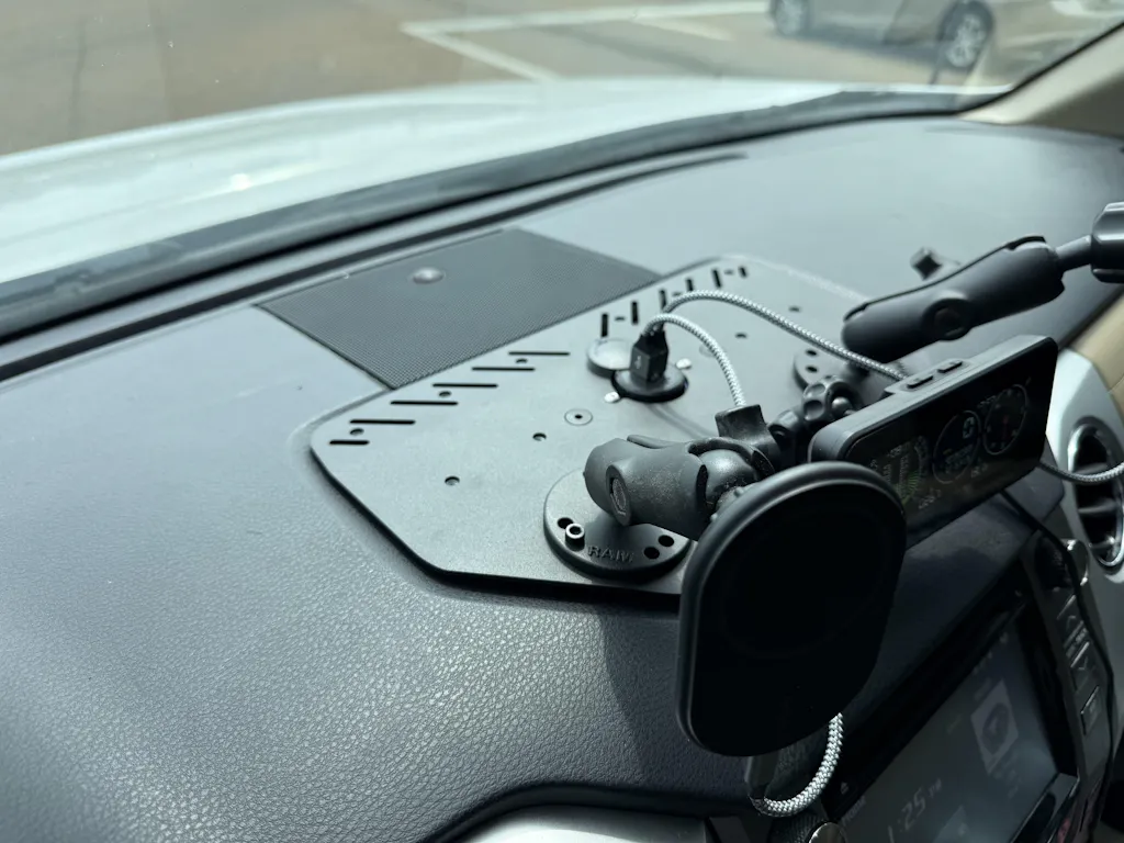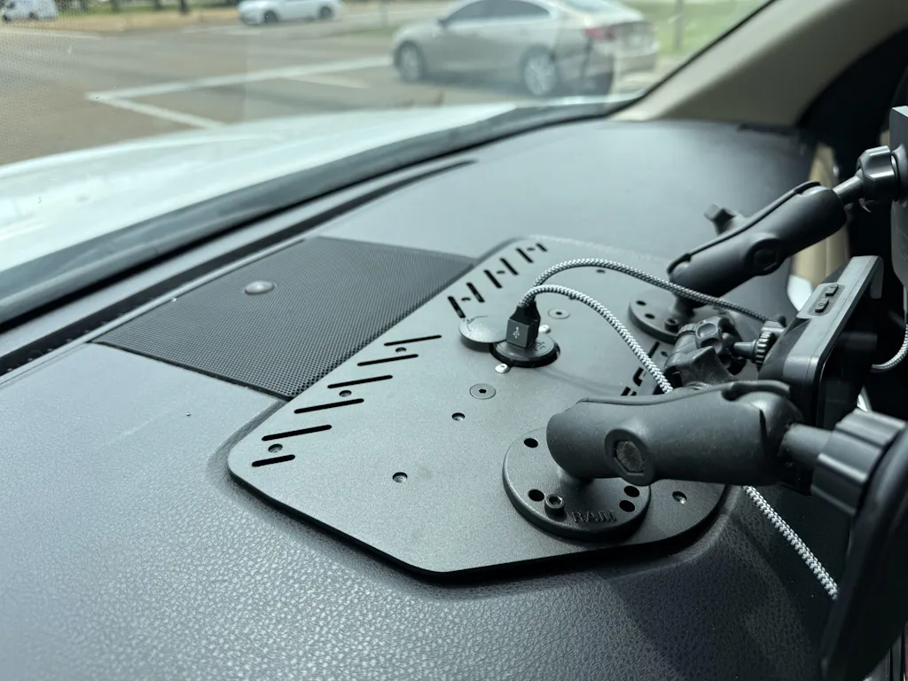The Rago Fabrication dash plate gives you the ability to mount multiple accessories at once: phones, tablets, GPS, and more! The integrated dual USB port allows for charging two devices while mounted.