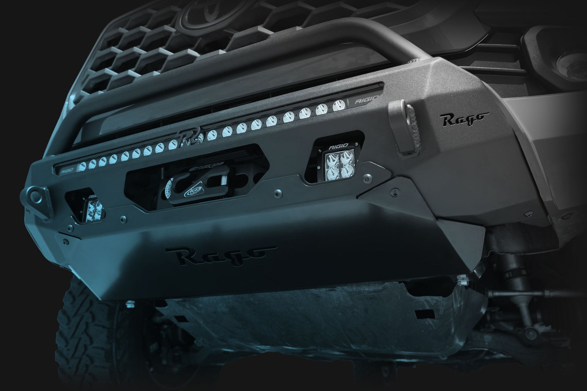 The bumper’s low-profile fitment and dual-stage hammer black powder coat finish presents a sleek design that compliments your Tacoma’s exterior styling. Made from durable steel, this is built to protect your rig from extreme off-road environments. The bumper can be paired with our 3/16-inch aluminum skid plate to prevent costly damages to your truck’s front undercarriage. Our front bumper retains the OEM fog lights, and it is compatible with Toyota Safety Sense. As always, all Rago products are proudly made in the USA.